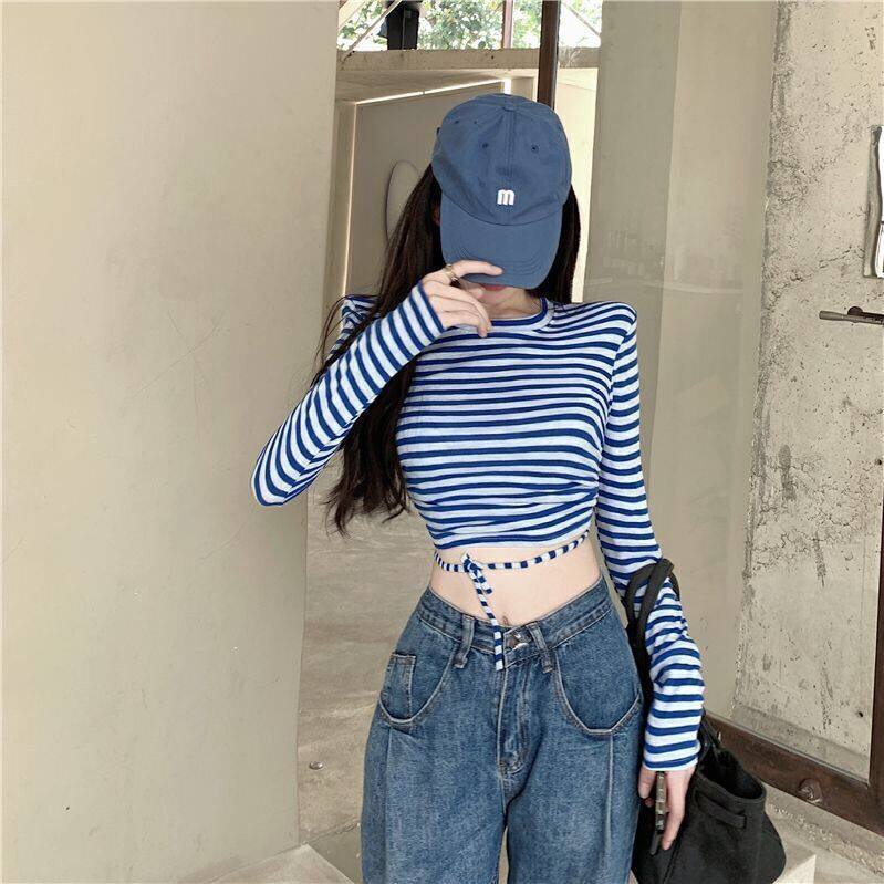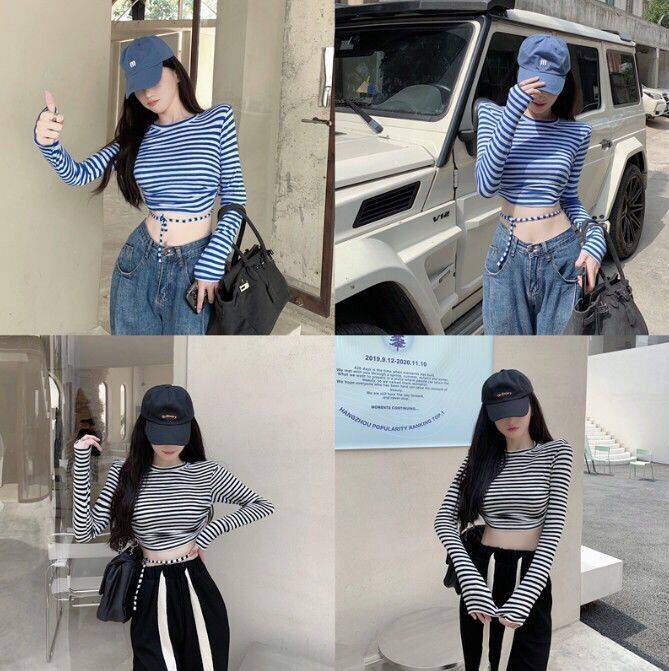 条纹T恤长袖彩色凹凸短款上衣
